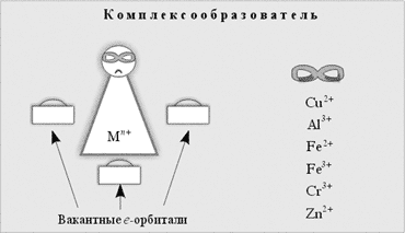 Итак, комплексные соединения имеют большое значение в природе, науке, технике, быту. Изучая химию, мы не раз убеждались, что применение и свойства веществ определяются их строением. Каково же строение комплексных соединений? Главное действующее лицо в комплексном ионе – комплексообразователь. Это положительный ион, имеющий свободные электронные орбитали. Под маской комплексообразователя могут скрываться следующие ионы: Cu2+, Al3+, Fe2+, Fe3+, Cr3+, Zn2+ (пиктограмма 3).