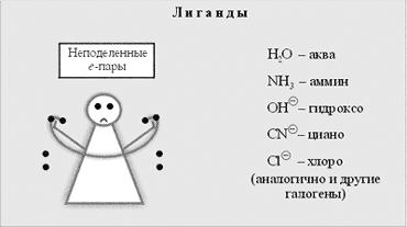 Кроме комплексообразователя в состав комплексного иона входят лиганды (от лат. ligo – привязываю). Лиганды буквально «связаны по рукам и ногам» своими неподеленными электронными парами, которые они несут как тяжкий груз. Лигандами могут быть нейтральные молекулы и отрицательные ионы. Примеры наиболее распространенных лигандов и их названия приведены на пиктограмме 4.