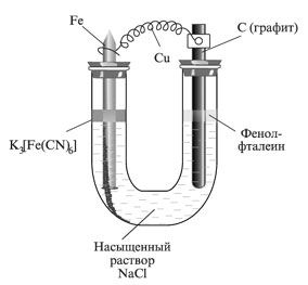глубокую царапину. Обе пластинки покрыть фильтровальной бумагой, смоченной раствором из 3 г NaCl, 3 г K3[Fe(CN)6] и 2–3 капель концентрированной HCl в 100 мл воды. Бумага должна плотно прилегать к металлическим пластинкам. Следить за появлением продуктов коррозии. Примечание. При наличии тонкой стальной проволоки, очищенной от следов коррозии, обмотать ею в одном случае гранулу олова,а в другом – цинка, оставив концы на 3–4 см. Далее опыт проводить по вышеописанному порядку |