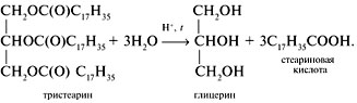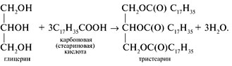 Некоторые животные (чаще водоплавающие птицы) используют жиры для смазки своих собственных мышечных волокон. Жиры повышают эффект насыщения пищевыми продуктами, т. к. они перевариваются очень медленно и задерживают наступление чувства голода. Учитель. Когда и кем были открыты жиры? Историки. Строение жиров было установлено благодаря трудам французских химиков М.Э.Шевреля и П.Э.М.Бертло. Так, в 1779 г. было установлено, что в состав жиров входит глицерин. Шеврель посвятил изучению жиров около 14 лет. В 1808 г. к нему обратился владелец текстильной фабрики с просьбой проанализировать состав мягкого мыла, получаемого на фабрике. Шеврель установил, что мыло – натриевые соли высших жирных кислот. Ученый изготовлял мыло из жиров различных животных, выделяя из них жирные кислоты. Так впервые были получены стеариновая, олеиновая и капроновая кислоты. Шеврель показал, что жиры состоят из глицерина и жирных кислот, причем это не просто их смесь, а соединение, которое, присоединяя воду, распадается на глицерин и кислоты. Синтез жиров осуществил в 1850-х гг. Бертло, нагревая в запаянных сосудах смесь глицерина и различных жирных кислот. Учитель. Химикам давно хотелось разобраться, что же такое жиры. Химики. Жиры – это сложные эфиры глицерина и высших карбоновых кислот (стеариновой, пальмитиновой, линоленовой, олеиновой и др.). Синтез одного из жиров (тристеарина) можно представить схемой: